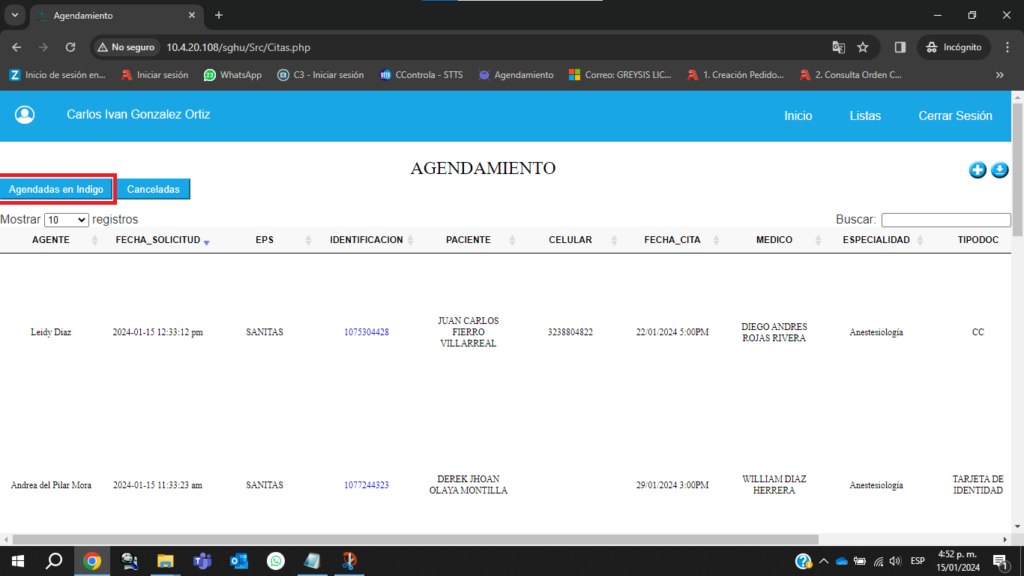 3. Damos clic en el botón ‘agendadas en índigo’ que se encuentra en el lado superior izquierdo