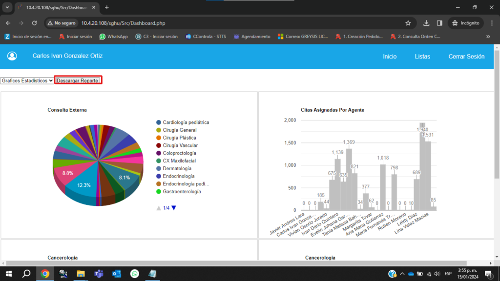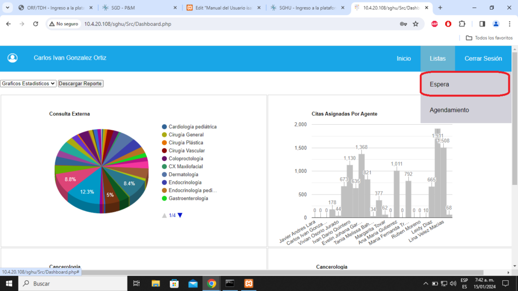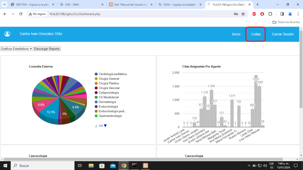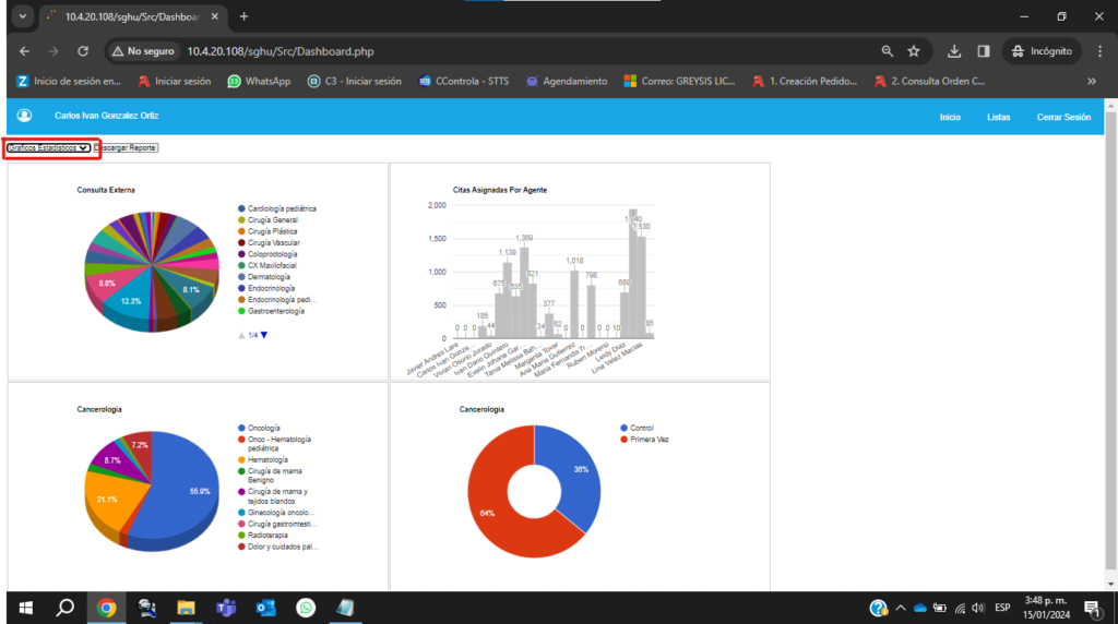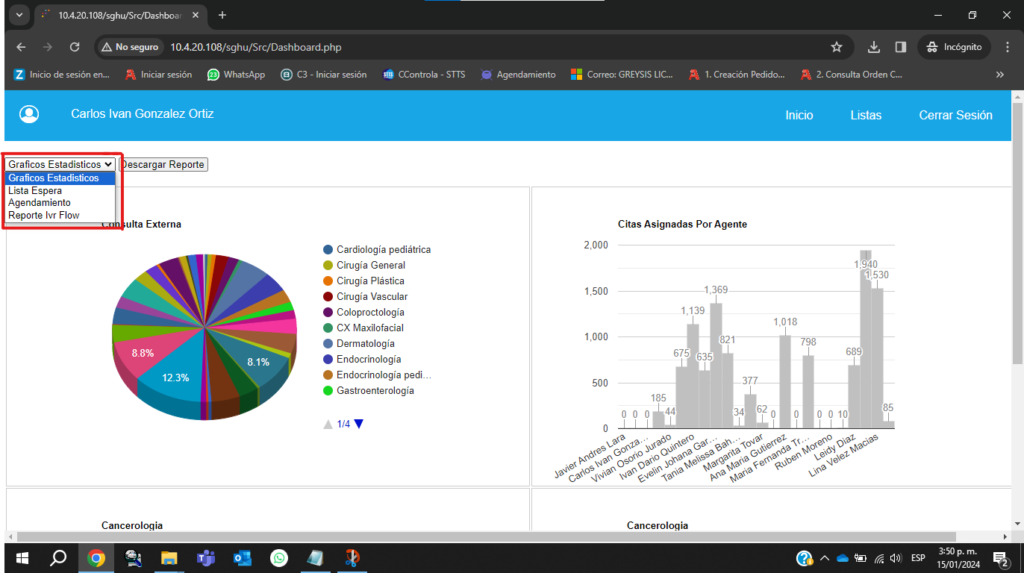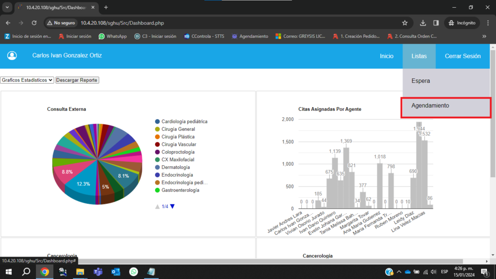 En la dashboard pagina de inicio del SGA nos aparecerán los gráficos de los reportes del sistema de agendamiento, nos aparecerá información sobre las listas de agendamiento (especialidad, por agente,).
